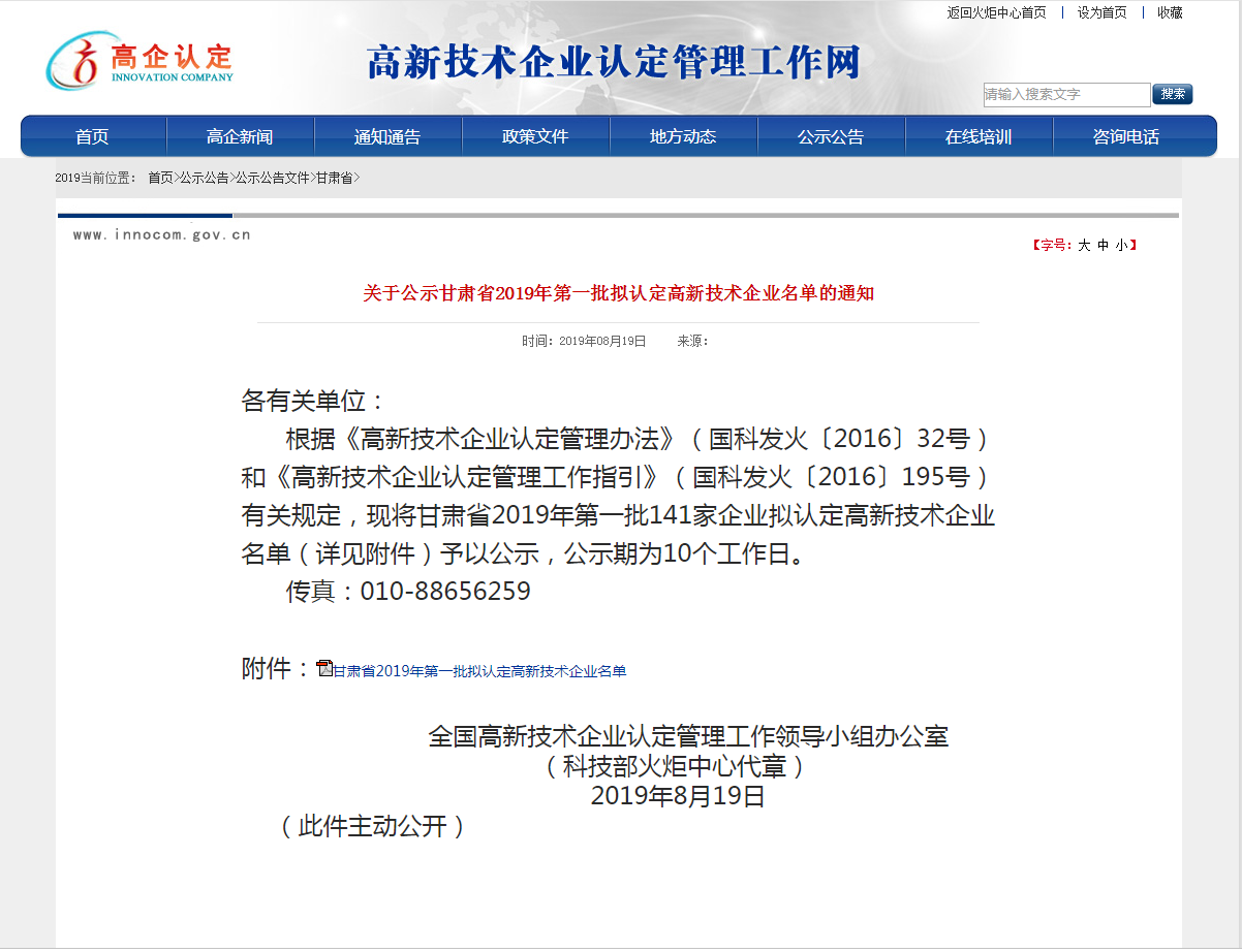 •      根據(jù)《高新技術(shù)企業(yè)認定管理辦法》(國科發(fā)火〔2016〕32號)和《高新技術(shù)企業(yè)認定管理工作指引》(國科發(fā)火〔2016〕195號)有關(guān)規(guī)定,經(jīng)公司申報、地方初審、專家審查等嚴格的申報程序,于2019年8月19日在“國家高新技術(shù)企業(yè)認定工作網(wǎng)”上公示了“甘肅省2019年第一批擬認定高新技術(shù)企業(yè)名單”甘肅安卓工程技術(shù)有限公司榜上有名。