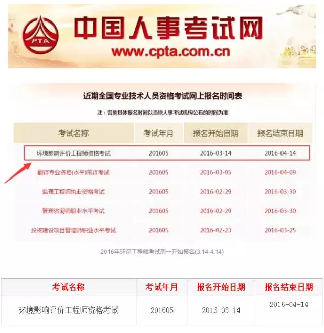 中國(guó)人事考試網(wǎng)3月12日公布“近期全國(guó)專(zhuān)業(yè)技術(shù)人員資格考試網(wǎng)上報(bào)名時(shí)間表”,其中“環(huán)境影響評(píng)價(jià)工程師資格考試”報(bào)名開(kāi)始日期2016-03-14,報(bào)名結(jié)束日期2016-04-14。