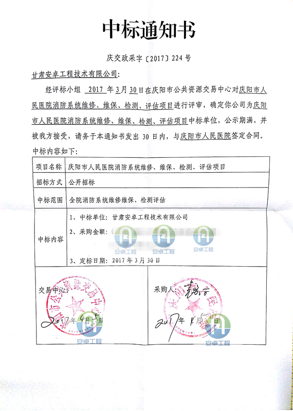 【中標公示】慶陽市人民醫院中標通知書